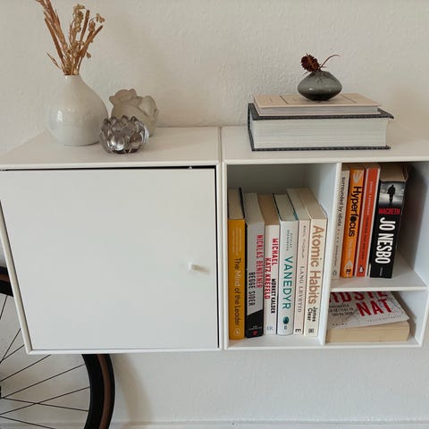 Alle moduler er i meget flot stand og kan enten stables, hænges på væg eller placeres separat. Systemet kan nemt udbygges eller kombineres med andre Montana-enheder for et personligt udtryk.