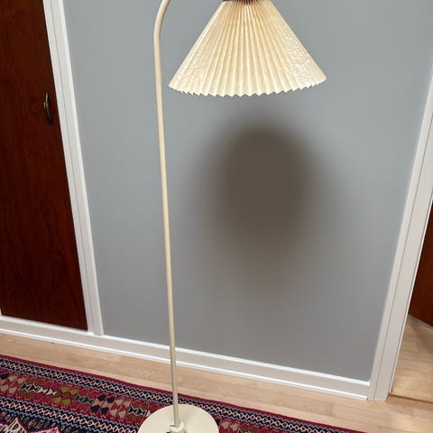 Le Klint gulvlampe med foldeskærm designet af Tobia Scarpa. Lampen har en hvid foldeskærm og en metalfod med hvid finish. Velegnet til brug i stue eller gang som en dekorativ og funktionel lyskilde. Lampeskærm trænger til udskiftning. Højde 145 cm. Selve metalkonstruktionen er hvid/beige.