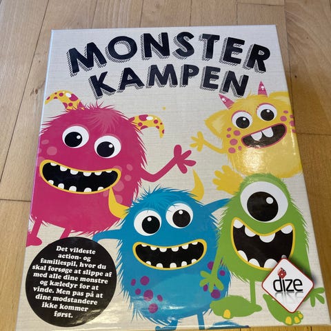 Monster Kampen brætspil til børn fra 4 år og op. Spillet indeholder brikker og spilleplade med farverige monstre. Spilletid ca. 10-30 minutter. Kan spilles af 2 til 4 deltagere. Formålet er at samle sine monstre eller klæde dem ud for at vinde spillet.