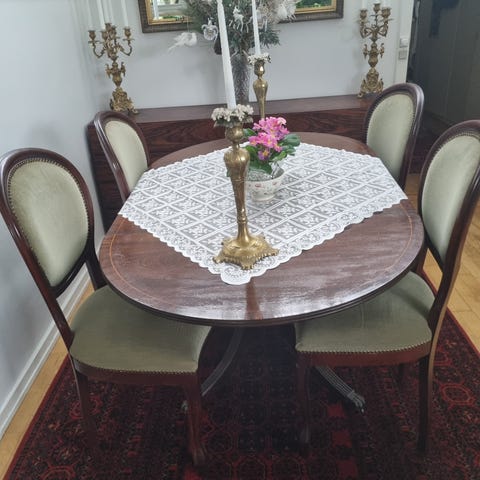 6 spisebord stole som trænger til nyt betræk. Træet er fin stand men som kan ses, er betrækket misligholdt.