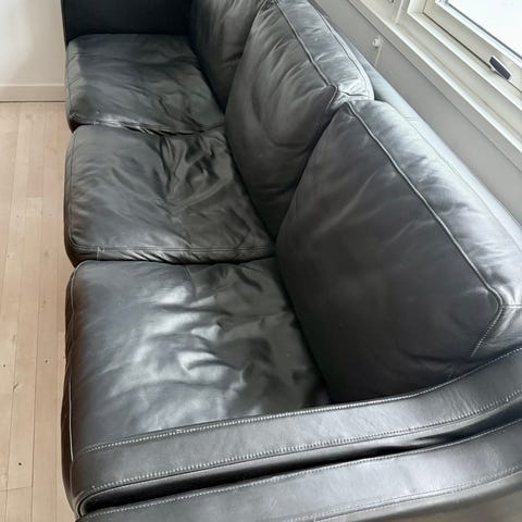 Velholdt sort lædersofa i god kvalitet. DBA mener det er en DUX, men det er en Skalma. Ingen huller i læderet, men lidt slidte kanter, som trænger til læderpleje.