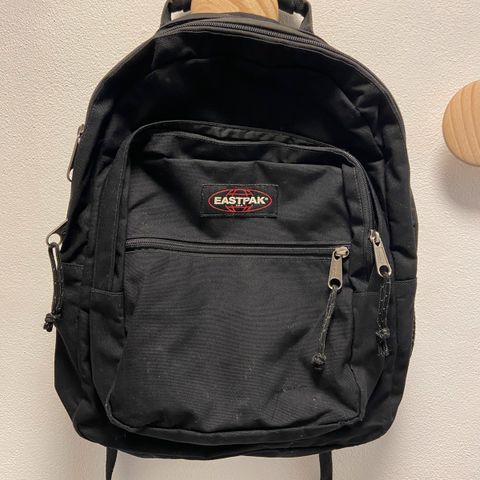 Eastpak rygsæk i blåmeleret stofmateriale. Er stort rum og to ekstra rum foran og en rum bagpå. polstrede skulderstropper og justerbare remme. Brugt som skoletaske