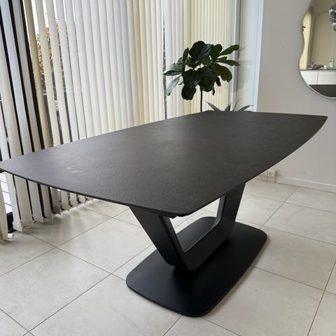 Elegant spisebord i askegrå keramik med mat askegrå stel.