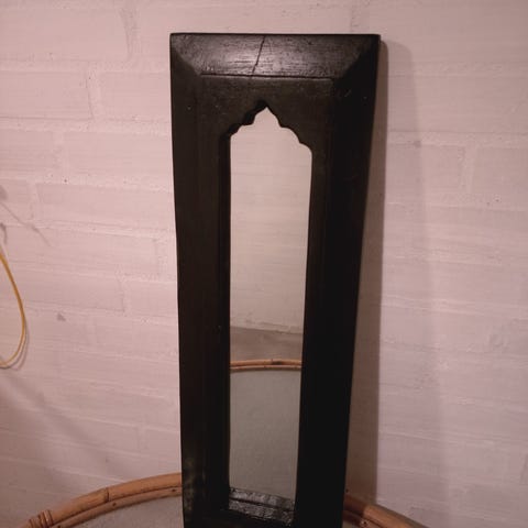 Dette unikke lågespejl er skabt af indonesiske træhåndværkere, hvor mørkt, tætvokset træ er forvandlet til et stykke brugskunst med sjæl. De detaljerede udskæringer slynger sig omkring spejlet som små håndskrevne linjer, der fortæller om tålmodigt arbejde, varme hænder og traditioner, der er blevet båret videre gennem generationer.