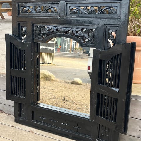 Når lågen åbnes, fanger spejlet lyset med en blød, drømmende klarhed. Når det lukkes, står du med et dekoreret træpanel, der næsten virker som et gammelt, romantisk vindue mod en anden tid.
