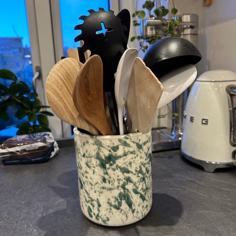 Fremstillet i keramik med blå kantdetaljer. Velegnet til opbevaring af køkkenredskaber eller andre småting i køkkenet.