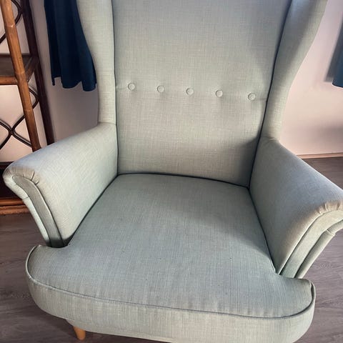 Strandmoen lænestol med puff fra IKEA. Stoffet med motiv af grønne og gullige blade. Passer godt til f.eks et sommerhus. Nypris 2400 kr