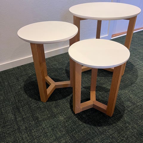 To fine sofaborde/sideborde i massiv bøg. Der er få brugsmærker på bordplader.