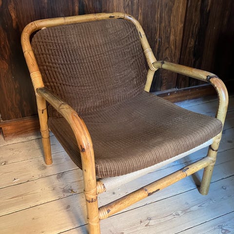 Fin god stand lænestol i bambus med hynder i støvet grøn. Købt i retro butik i Ejstrupholm engang for nogen år siden for måske 700-800 kr. Og aldrig rigtigt brugt hos os, har bare stået.