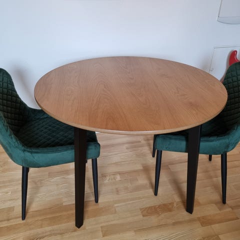 Et par mørkeblå spisestole, som sælges da de ikke bliver brugt mere.