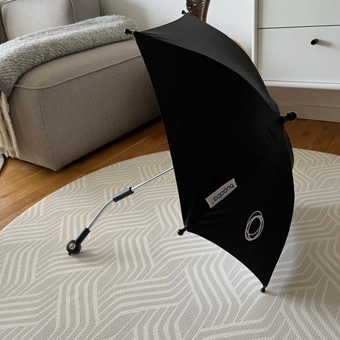 Bugaboo Parasol i grå farve med justerbar arm og klemme til montering. Designet til at give skygge og beskyttelse mod solen ved brug med barnevogne eller klapvogne.