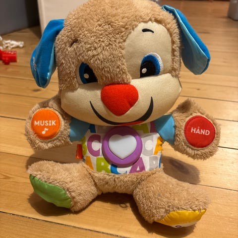Fisher-Price blød bamse med farverigt tøj. Den synger. Bamsen har beige krop, blå ører, og en rød trøje med hjerter og bogstaver i flere farver. Egnet som legetøj for børn.
