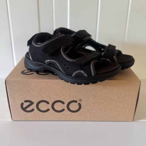 ECCO ubrugte unisex sandaler i størrelse 39. Sandalerne er sorte med justerbare stropper og har en hvid sål med mønster for bedre greb. Materialet er en kombination af tekstil og syntetisk, designet til komfort og holdbarhed.
