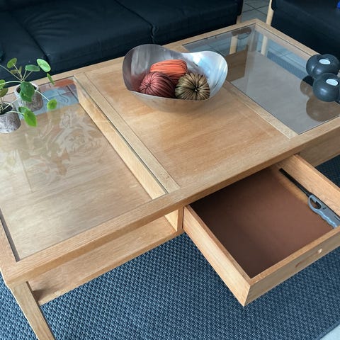 Super fint sofabord med glasplade og store rummelige skuffer.