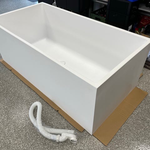 Hvid oval fritstående badekar med integreret sort nakkestøtte. Badekarret er designet til komfort og afslapning. Medfølgende krom gulvstående armatur med håndbruser. Materiale og præcise dimensioner ikke oplyst.