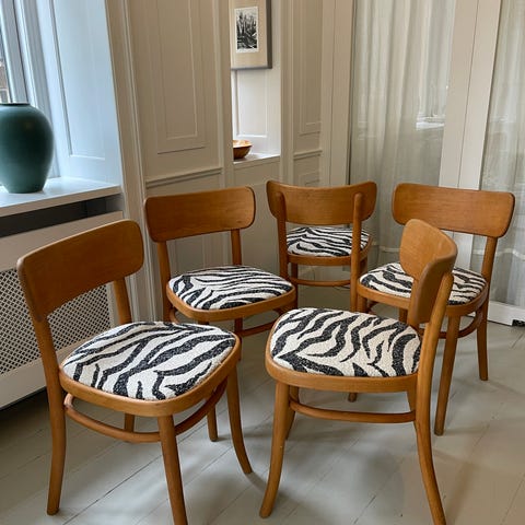 Stolene er udført i bøgetræ og stemplet “FH” i stellet. De er nyligt professionelt ombetrukket med Tablu fra Kvadrat – et raffineret tekstil, der fremhæver stolens enkle form og varme træ.