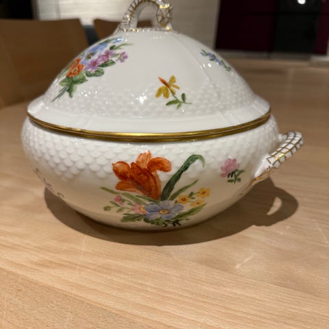 B&G Porcelæn terrin med låg i hvid porcelæn med guldkant. Terrinen rummer 1,5 l og har dekorative håndtag og låg med fletmønster. Fremstillet i Danmark af B&G.