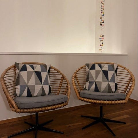 Utroligt behagelig bambuslænestol med fodskammel, begge har stel af bambus og stofbetræk. Ingen skader på bindinger. Rigtig pæn stand.
