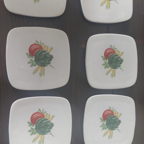 5 kagetallerkener, hvor 2 er Alumina og 3 Fajance, pris pr. Stk 40 kr.