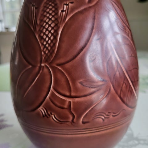 Brun pæreformet vase på lav fod i kunstfajance. Model Solbjerg nr. 1689