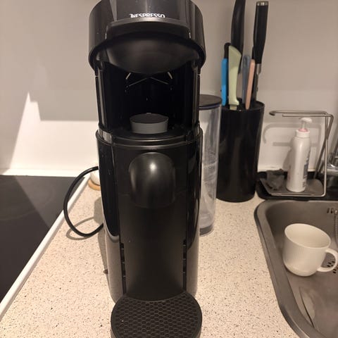 Nespresso Vertuo Pop kapsel kaffemaskine i gul og sort farve. Nespresso De Longhi type ENV90. Måler ca. 43 x 14 x 25 cm. Nypris ca. 1000 kr.