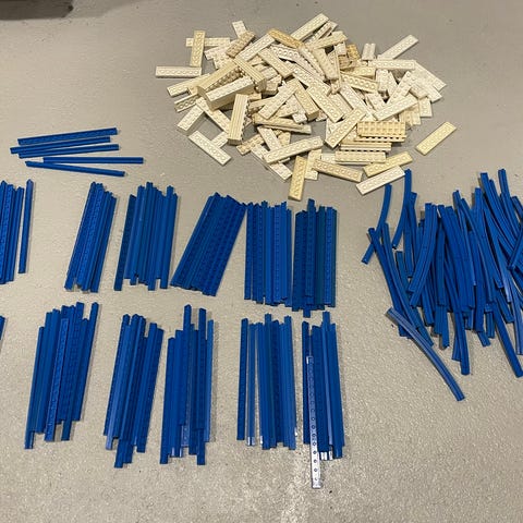 Lego blå togskinner. 29 lige skinner, 58 buede, 2 sporskifte, 1 defekt sporskifte.