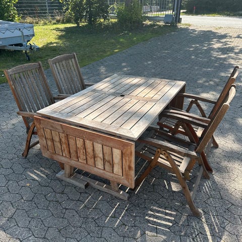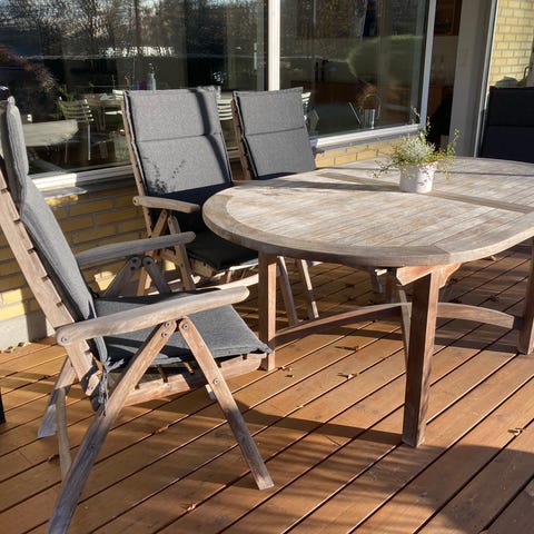 Stolene er lavet i kraftigt trykimprægneret træ, der tåler at stå ude hele året. Kanterne er fint skåret skråt hele vejen rundt for et pænt og professionelt finish. Konstruktionen er stabil og solid, og hynderne er tykke og komfortable.