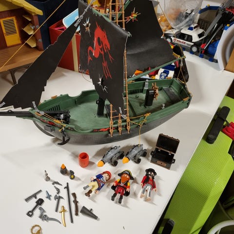 Playmobil 5894 pirat sæt med 2 figurer, en blå og en rød, samt tilbehør som kanon, sværd, papegøje, og robåd. Sættet indeholder 37 dele med kuffert og er egnet til børn i alderen 4-10 år. Mangler: blå bælte over ridder kroppen, begge pil, pistol.