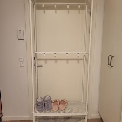 Lækkert stabilt garderobestativ som har en skohylde samt hjul i den ene ende som gør det nemt at flytte rundt på