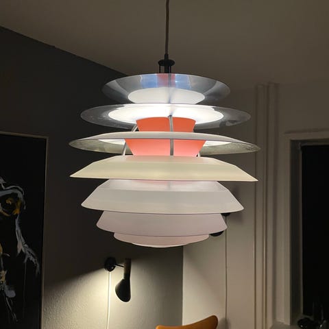 Jeg sælger vores smukke originale vintage PH pendel. Lampen er blevet nænsomt renoveret og fremstår i flot stand, med ny indvendig fittings og ny flot stofledning.
