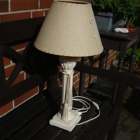 Lampe, GRANAT, GAMMELT GRANAT HYLSTER UDFORMET SOM LAMPE, MONTERET MED TEAK I TOP OG BUND.
