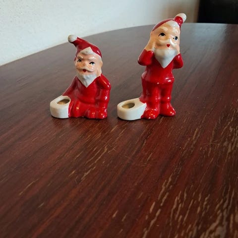 Et par vintage julemandsfigurer, sandsynligvis fra 1950'erne eller 1960'erne produceret i Japan og er kendt for deres nostalgiske, kitschede udtryk, som fremstår meget flot og livagtig og som appellerer til samlere af gammeldags julepynt. De har udtryksfulde ansigter, der typisk er lavet af formstøbt gummi eller plast, mens kroppen er dækket af rød filt, og skægget er af kunstigt hår eller lignende materiale. De fremstår fine og velholdte i originalt tøj og sko og er ca. 10 cm høje. Fra røgfrit hjem og klar til at flytte ind et nyt sted for at skabe julestemning.
