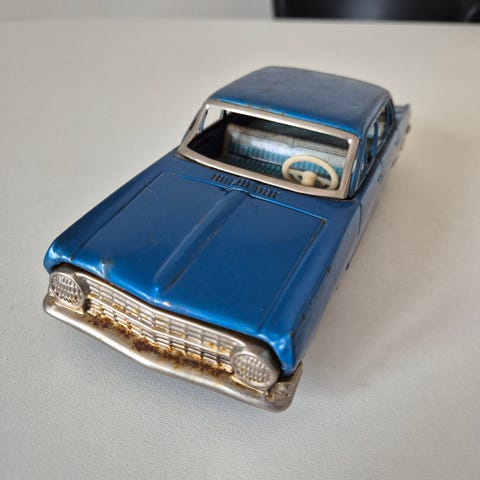 Gl. tysk blikbil, af mærket Arnold Candidat, m. friktionsmotor der fungerer som den skal.