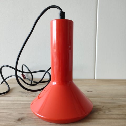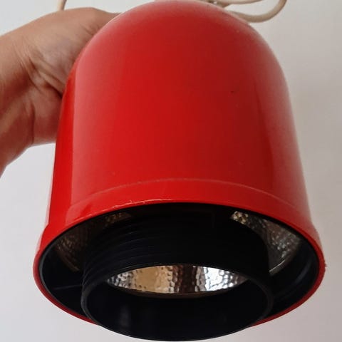 retro lampe, 70’er lampe, vintage pendel, rød lampe, loftslampe, plastlampe, dansk retro design, cylinderlampe, pop art stil