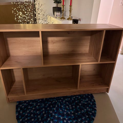 Bogreol med 5 rum i olieret egetræ. Reolen er i sin tid købt hos BOBO og minder om deres nuværende "NOCNOI Puzzle rektangulær reol", men er dog uden tapper og i stedet samlet med skruer.