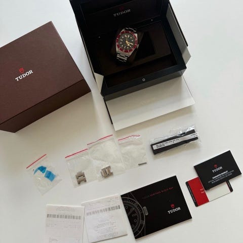 Tudor Black Bay ur med en blå skive og stållænke. Uret er i god stand og kommer med æske og papirer.