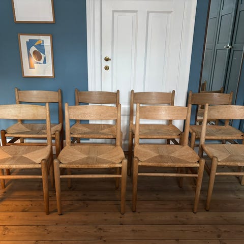 CH 36 stole i bøg sæbe med natur fletsæder. Alle stole er stabile, men vil have godt af nye flet sæder (kan varmt anbefale DKA design i Kgs. Lyngby.