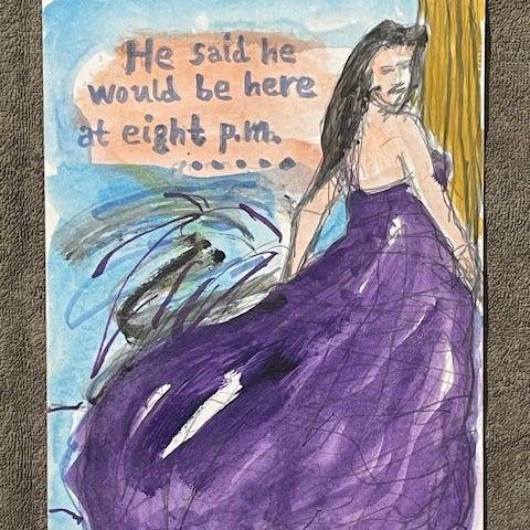Alba S. Enström, mixed media på papir, Check Out, 2016, 15 x 21 cm, 950 kr. eller bedste bud.