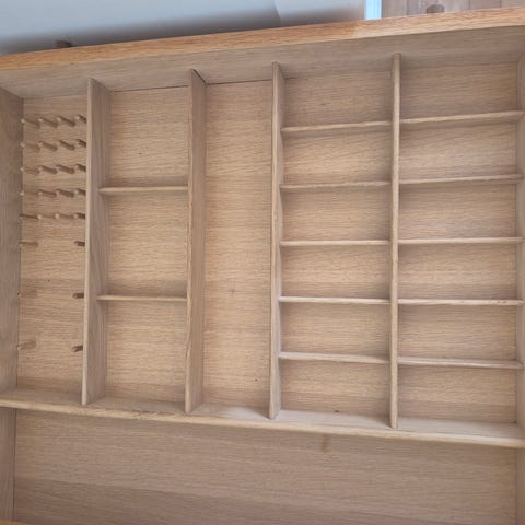 Selve bordpladen kan skydes til side hvorved et stort opbevaringsrum kommer til syne. Heri er der desuden en bakke opdelt i mindre rum til sytilbehør mm.