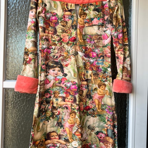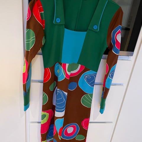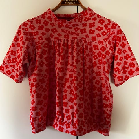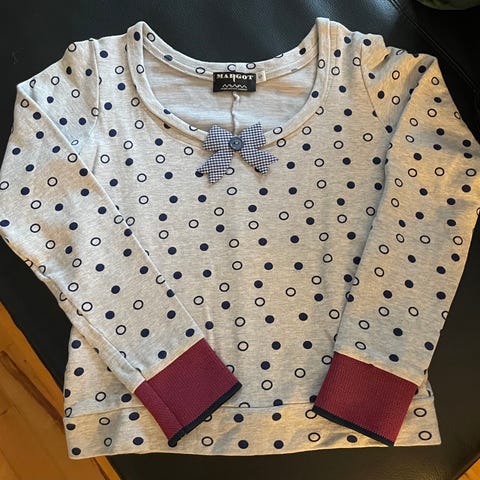 MARGOT mønstret bluse i størrelse L i blå farver. Fremstillet af 95% økologisk bomuld og 5% lycra. MARGOT er kendt for at lave tøj med smukke retromønstre.. Blusen har en fin lille krave og lynlås bagpå.
