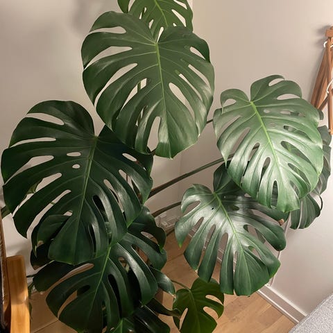 Monstera Deliciosa indendørs plante med store, grønne, fligede blade. Planten er velegnet til indendørs brug og kræver moderat lys og vanding. Den har en dekorativ effekt i hjemmet og kan vokse til en betydelig størrelse under passende forhold.