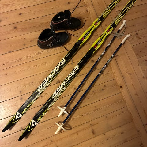 Fischer langrendsski sæt inklusive to par ski og tilhørende skistaver. Skiene har bindingssystemer monteret og er designet til langrend. Skistavene er af passende længde til langrendsski. Farverne på skiene inkluderer blå, hvid og gul. Materialerne er typiske for langrendsski og skistave, egnet til brug på sne.