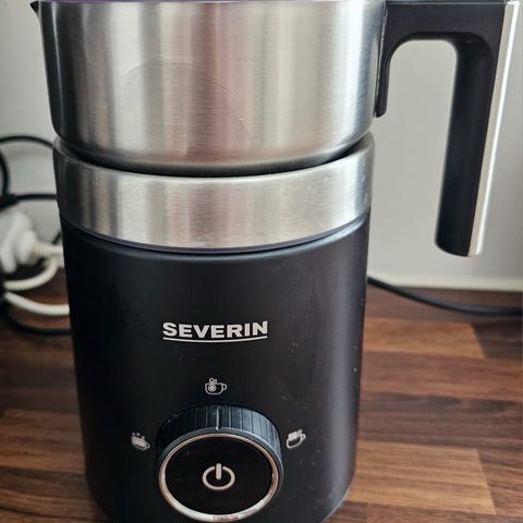 Sjøstrand Mælkeskummer i rustfrit stål med sort håndtag. En elektrisk enhed designet til at skumme mælk til kaffe og andre drikkevarer. Indeholder en skummekop med målemarkeringer og en enkelt knap til betjening