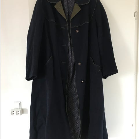 Elegant blå uldfrakke med bordeaux farvet besætning str. 50