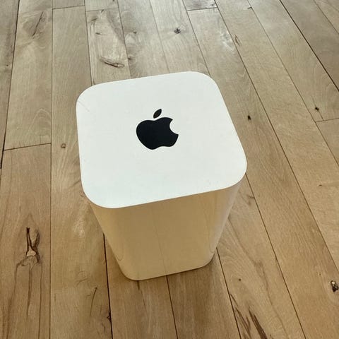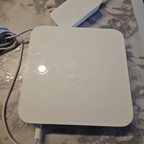 2 x Apple AirPort Extreme Router i hvid farve. Enheden har flere Ethernet-porte på bagsiden til kablet netværksforbindelse. Kompakt design med Apple-logo på toppen. Inkluderer strømkabel og monteringsbeslag.