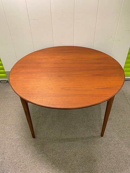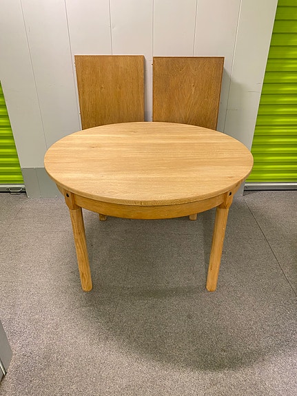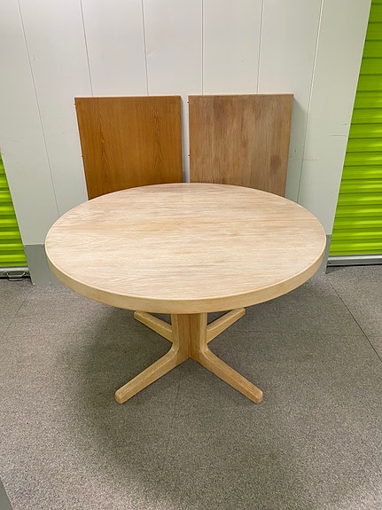Lækker retro rundt spisebord i massiv egetræ med udtræk, to tillægsplader. H. 74 cm. Tillægsplader 50 cm. Spisebord med plader totallængde 220 cm. Fremstår i super stand. Evt kan lev aftales