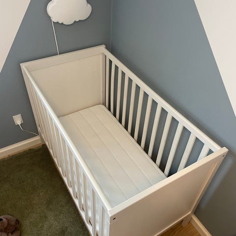 IKEA godnatt Tremmeseng børneseng i hvid farve med tremmer og tre opbevaringsskuffer under sengen. Mål 60×120.