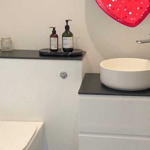 OBS. Der er en lille flig maling bagerst på badmøblet, under bordpladen, som er faldet af og limet på igen, se sidste billede.