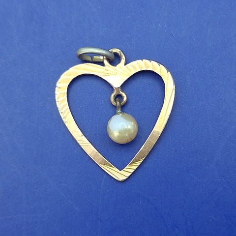 Hjertet er lavet af ben - muligvis elfenben - og øskenen er lavet af noget guldbelagt metal.