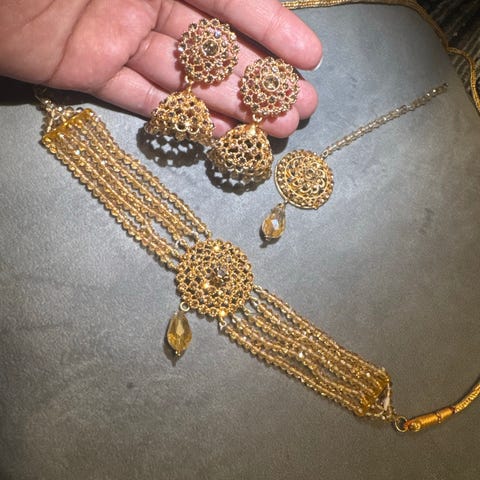 Smykkerne har små blomsterformede vedhæng med glitrende ikke-ægte sten og flotte firkantede led, som giver et eksklusivt, indisk/pakistansk inspireret look – perfekt til fest, eid, bryllup eller andre særlige lejligheder.